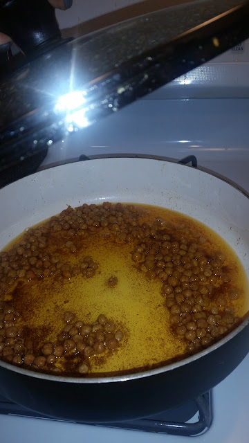 Chickpeas pop (sometimes OUT of the pan), the oil splatters,