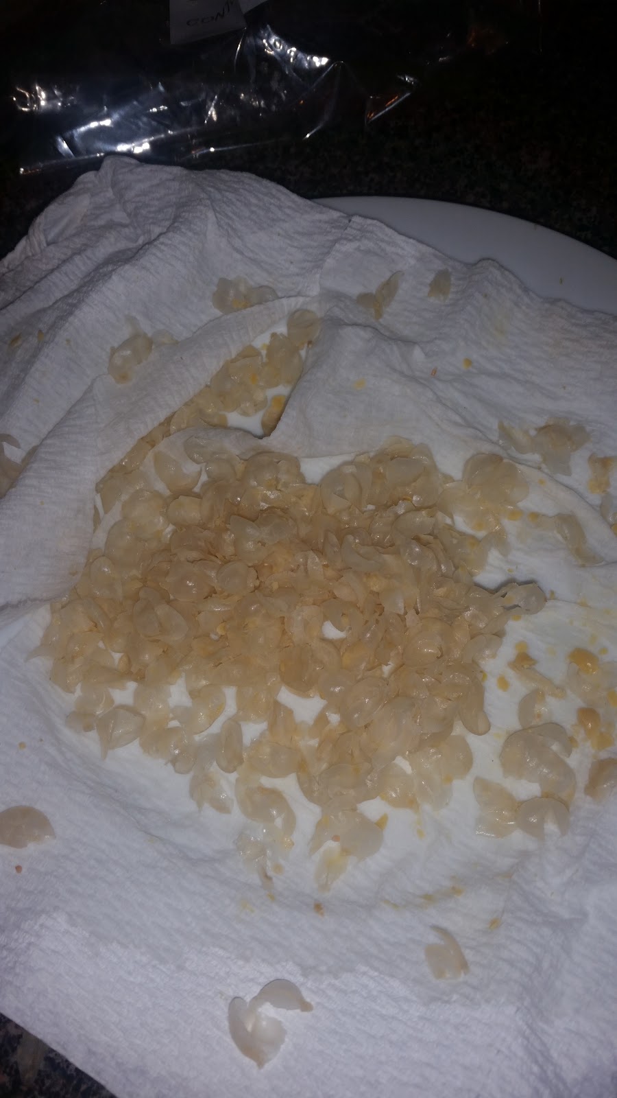 I started out by rinsing and peeling the chickpeas, setting the broth aside in a container to use later for making soup or cooking. I read somewhere that peeling them ultimately results in crispier garbanzo beans. I also read that, if making hummus, peeling them, results in a creamier product. To peel the 'peas, you drain after rinsing and place on a paper towel. I use a plate to house the towel. Envelop the beans in the p/t, applying a little pressure and jostling/wriggling them around beneath the towel. This loosens the shell. It also helps dry the beans.